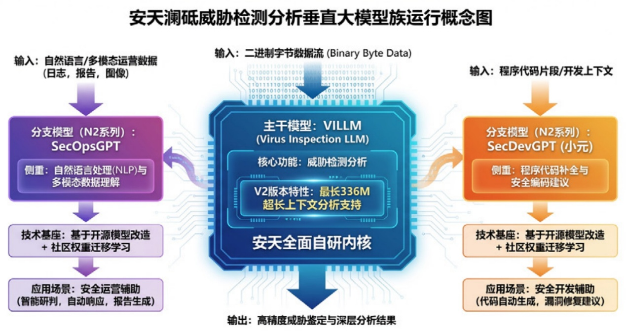 澜砥大模型的主干模型VILLM (Virus Inspection Large Language Model)可处理二进制字节数据、进行威胁检测分析,支持最长336M的超长上下文分析。另外两个分支模型SecOpsGPT(大安)侧重自然语言处理与多模态数据理解、SecDevGPT(小元)侧重程序代码补全,分支模型基于开源模型改造并使用社区权重进行迁移学习训练,分别用于安全运营辅助和安全开发辅助。