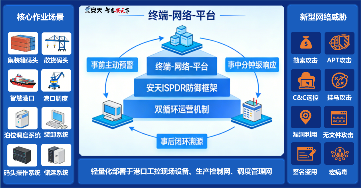 本方案专为港口关键信息基础设施工控系统打造,深度适配集装箱码头、散货码头、自动化无人码头、港口调度中心、泊位调度系统、码头操作系统、装卸储运系统等核心作业场景。通过采用“终端-网络-平台”三层协同防护架构,结合安天ISPDR防御框架和基于OODA与PDCA的双循环运营机制,实现从被动防护向主动预警、从单点布防向协同联动的纵深防护体系,构建了覆盖事前、事中、事后的全流程安全防护能力,最终达成威胁检测精准化、响应处置分钟级、系统资源轻量化的技术效果,解决了港口关键信息基础设施工控系统面临的新型网络攻击问题。