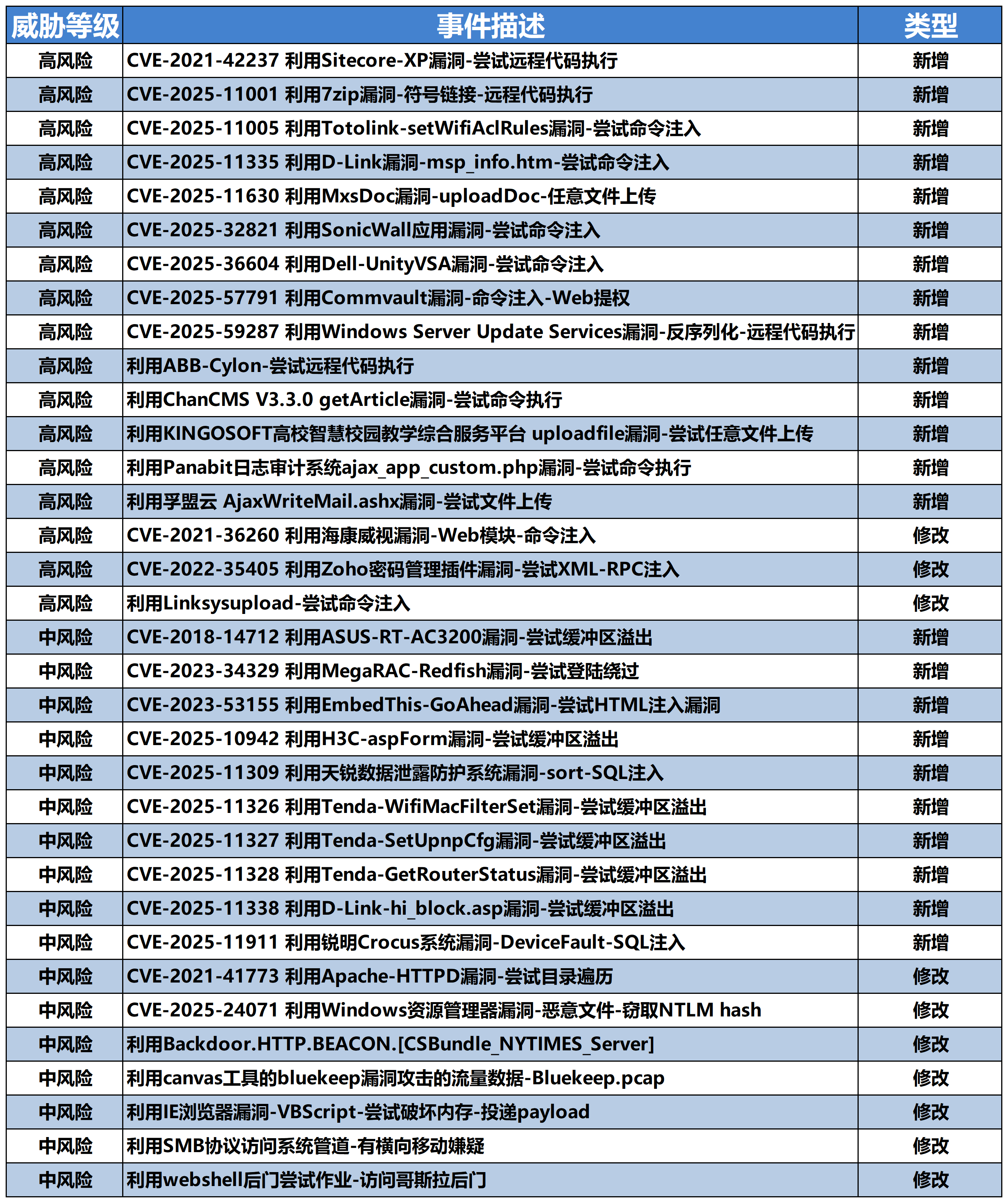 安天网络行为检测引擎收录了近期流行的网络攻击行为特征。本期新增检测规则56条,本期升级改进检测规则50条,网络攻击行为特征涉及漏洞利用、文件上传等高风险,涉及代码执行、代码注入等中风险。