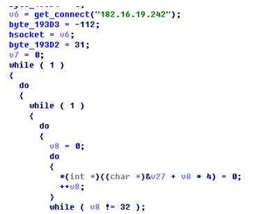 Mirai.Nov没有继承Mirai家族原来的加密算法,直接将C2明文写入木马代码中(如图2-3 被控端木马创建链接),说明Mirai.Nov在C2隐藏方面的有所减弱。