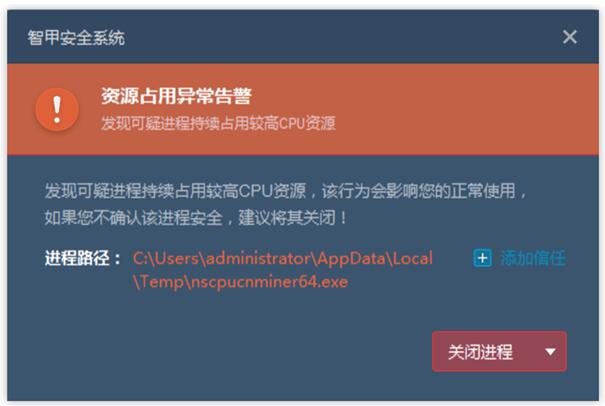 面对恶意“挖矿”软件,安天智甲采用了行为分析结合终端资源监控的防御方案。当终端的某进程有疑似“挖矿”的暴力计算行为,或进程CPU资源使用异常、端口使用异常时,安天智甲能够立即向用户告警,并可阻断该进程行为,实现对终端的有效防护。