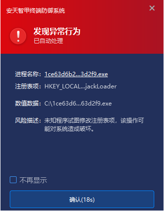 除此之外,智甲还可以通过主动防御功能发现可疑的启动项创建行为,在持久化阶段拦截程序行为阻止后续的恶意攻击动作。