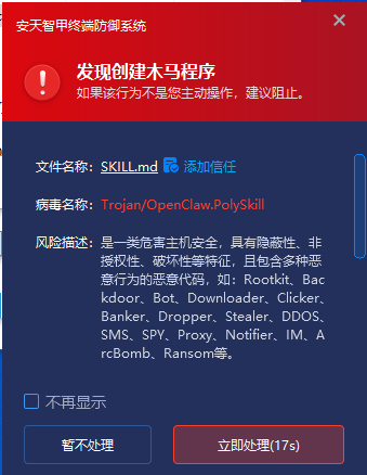 智甲产品集成安天AVL SDK反病毒引擎,结合驱动级主防模块,实时监控AI Agent从非官方下载安装的恶意Skills、脚本文件和恶意篡改等行为,自动化进行病毒检测;并且通过对大量恶意Skills跟踪和特征提取,安天AVL SDK反病毒引擎有针对性增加大量Skills检测规则,有效支撑使用安天引擎的网安和AI生态合作伙伴,提升OpenClaw的部署和运行安全。