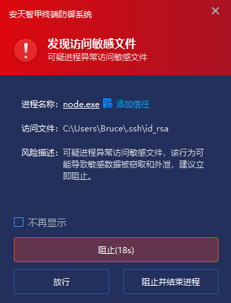 OpenClaw等众多AI Agent本身拥有文件读写、Shell执行、API密钥管理等高系统权限,可直接获取用户的加密货币钱包信息、API密钥、SSH密钥、浏览器密码等敏感数据。智甲可保护用户的敏感数据存储目录,禁止OpenClaw读取和操作目录内文件,实现重要数据与OpenClaw隔离,防止敏感数据窃取和外泄。