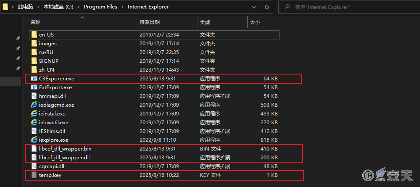 此类恶意程序会在C:\Program Files\Internet Explorer中释放C3Exporer.exe、libcef_dll_wrapper.dll、libcef_dll_wrapper.bin、temp.key等文件。