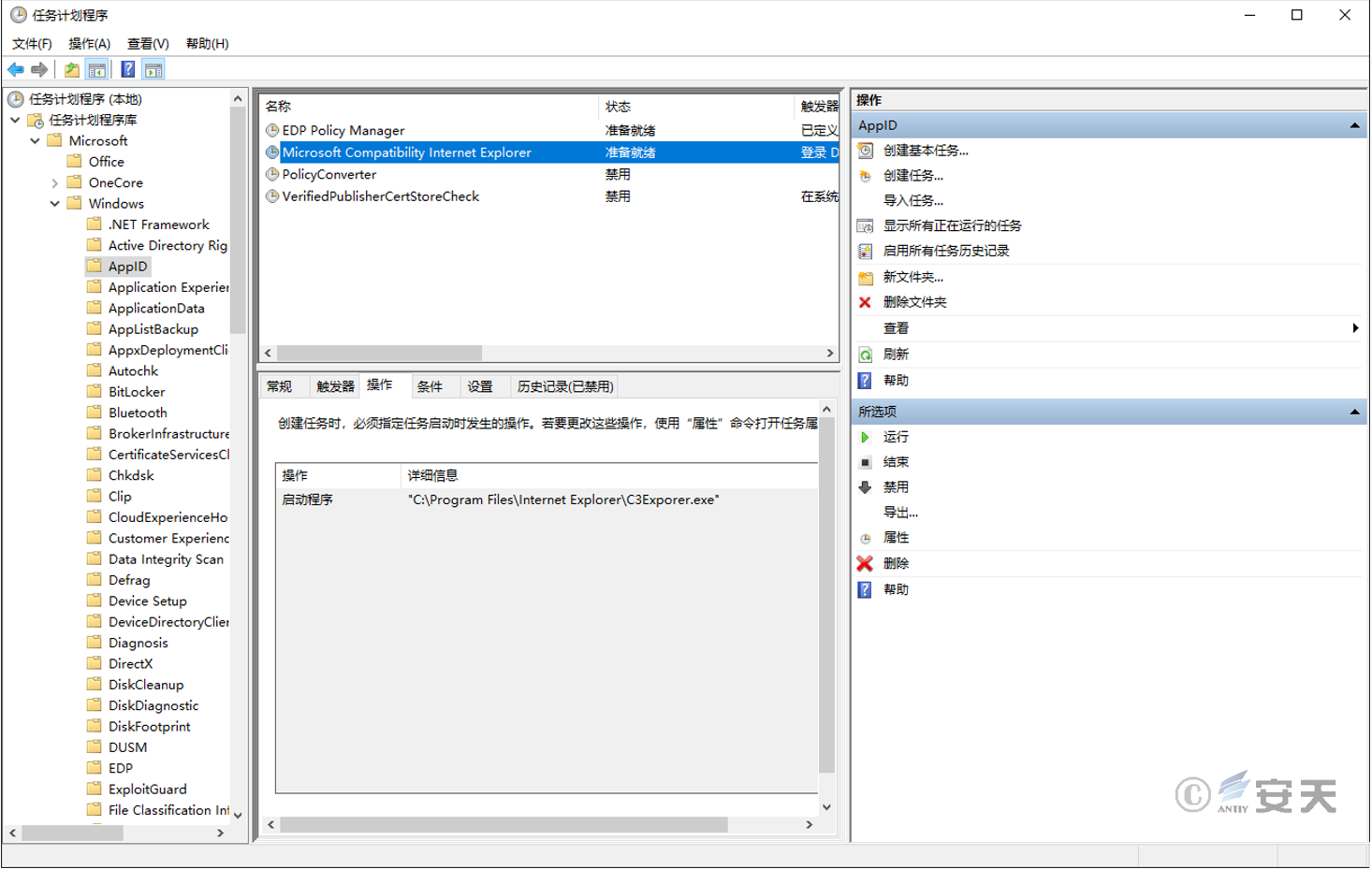 任务计划程序的\\Microsoft\\Windows\\AppID中存在启动C3Explorer.exe程序的恶意计划任务,恶意程序以此建立持久化机制。