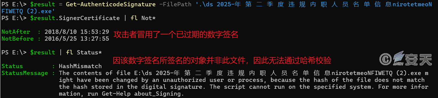 攻击者通过添加一个无效且已过期的数字签名,以绕过白防机制不成熟的主机防护软件,该数字签名所签名的对象与该文件不符,因此无法通过签名校验。