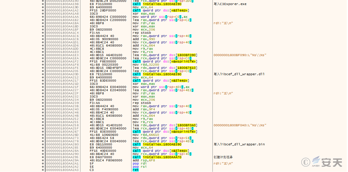 该DLL文件中嵌有C3Exporer.exe、libcef_dll_wrapper.dll和libcef_dll_wrapper.bin,在C:\Program Files\Internet Explorer中写入这三个文件(白加黑),并在\\Microsoft\\Windows\\AppId处为C3Exporer.exe创建计划任务,以实现持久化。