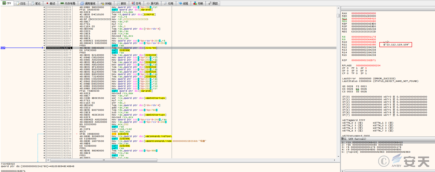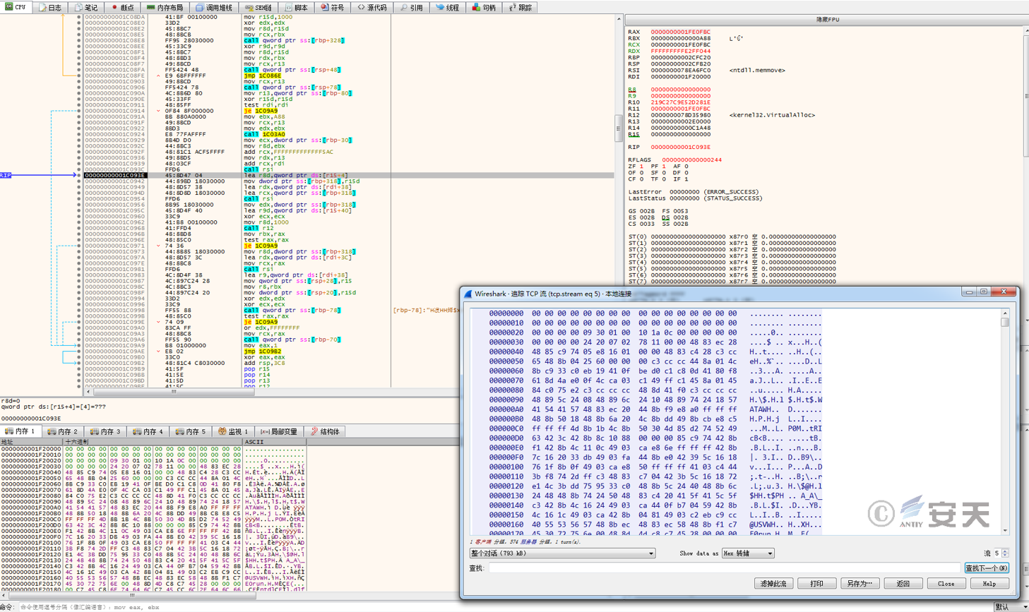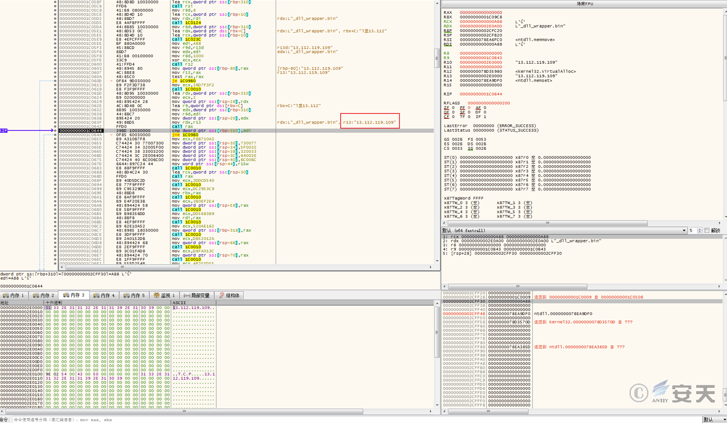 申请一段内存空间,与C2服务器地址连接并接收数据。