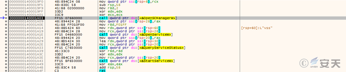 遍历查找VSS服务后启动该服务,从而执行VSSVC.exe进程。