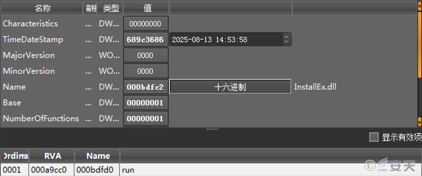 在内存中对其进行解密,得到一个原名称为“InstallEx.dll”的文件,并执行其“run”导出函数,实现内存运行。