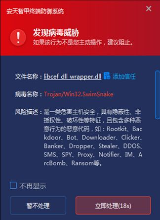 智甲可对本地磁盘进行实时监测,对新增文件自动化进行病毒检测。针对此次威胁,当病毒文件libcef_dll_wrapper.dll文件落地本地时,智甲会立即对病毒文件进行查杀并向用户发送告警,有效阻止病毒启动。