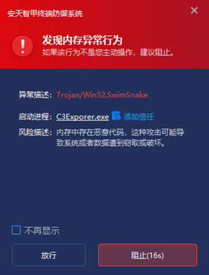 另外智甲具备驱动级主动防御模块,可以对进程行为实时监控,当发现进程存在风险行为时可立即拦截,有效防止攻击行为执行。本次事件中,当攻击者利用C3Exporer.exe加载恶意文件libcef_dll_wrapper.dll时,智甲会通过内存防护模块捕获恶意程序加载行为,并立即拦截。