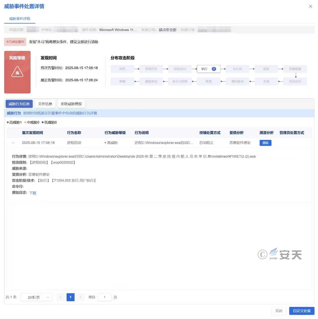 经过测试,安天智甲终端安全系列产品(以下简称“智甲”)依托安天自研威胁检测引擎和内核级主动防御能力,可以有效查杀和防御本次发现病毒样本。