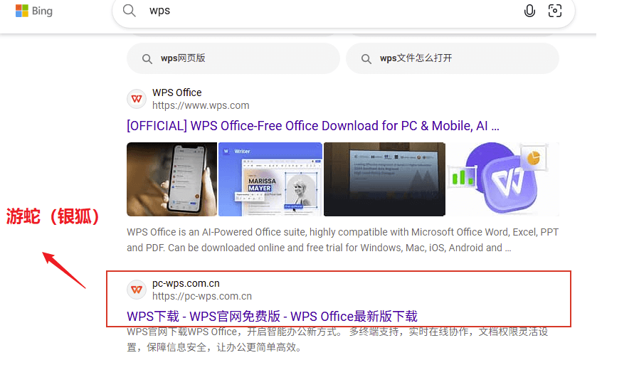 通过bing搜索“wps”发现,第1页的第3位是“游蛇”组织伪造的钓鱼网站,结果如图所示: