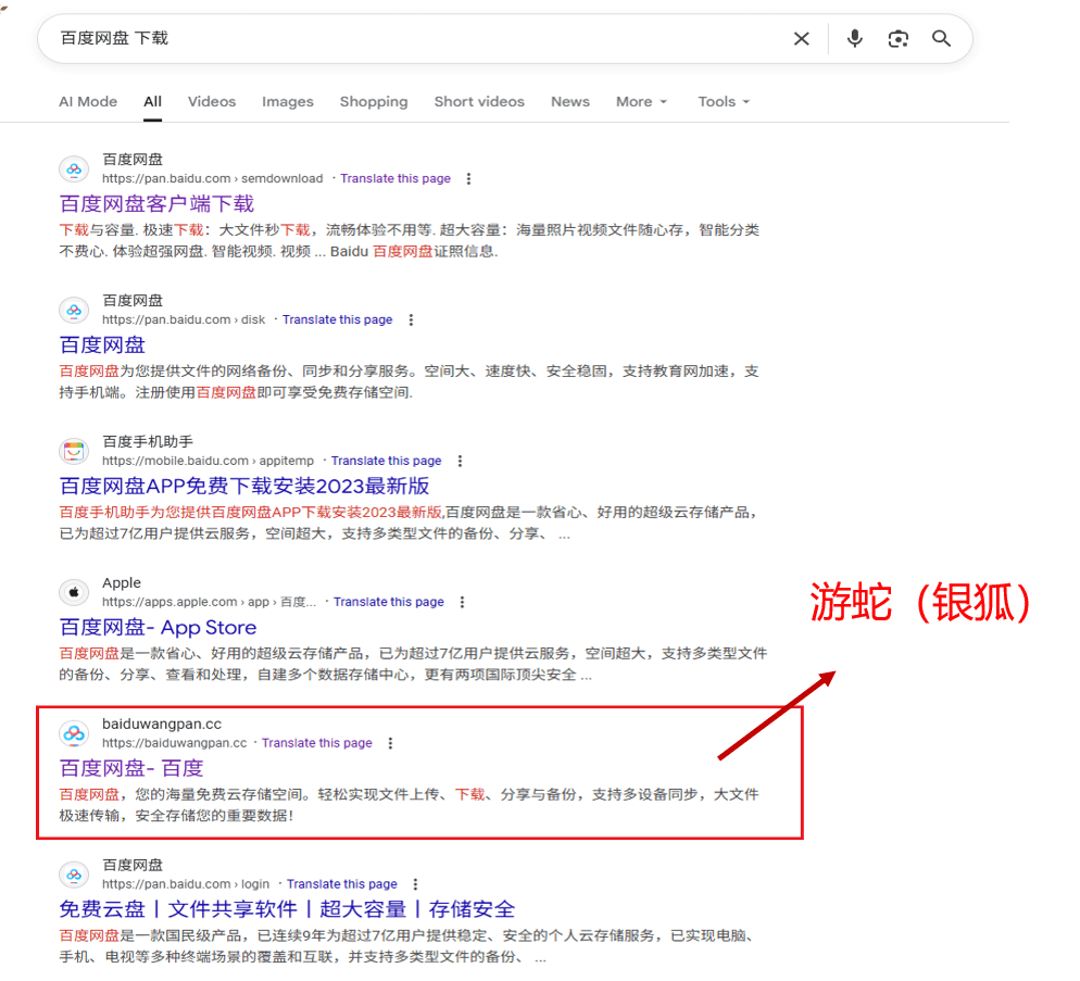 “游蛇(银狐)”黑产利用谷歌搜索引擎SEO技术进行投毒攻击,使其搭建的仿冒下载网站在搜索结果中的排名靠前。识别仿冒网站请查阅安天此前发布的分析报告《“游蛇(银狐)”黑产密集仿冒各类流行应用:WPS下载站打假专辑》进行钓鱼网站识别与防范。