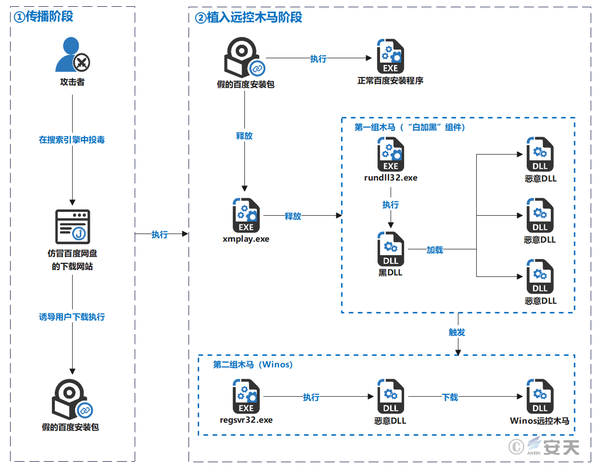 安天CERT近期发现,“游蛇(银狐)”团伙仿冒百度网盘安装包,执行“免杀”升级的恶意载荷,通过滥用Windows系统自带可执行文件加载并执行恶意DLL来规避杀软检测。放弃了此前在同目录以“白加黑”方式加载恶意DLL的做法,改为利用系统可执行程序(如rundll32.exe、regsvr32.exe)加载恶意模块并释放两组木马程序。并触发式投放远控木马,Winos远控木马仅在检测到系统中存在即时通讯进程(WeChat(微信)、DingTalk(钉钉)、Telegram、WhatsApp等)时才会被释放,通过人工远程操控受感染设备,利用聊天工具的社交属性发起拉入群组、定向转发等操作实现内部高效扩散,而非无差别投放,通过此条件提升了攻击传播效率,并通过精准触发机制降低了被安全产品查杀的机率。如果没有上述聊天工具,则仅投放另一组木马,该木马功能与远程C2保持联络、下载恶意组件、回传相关信息等。