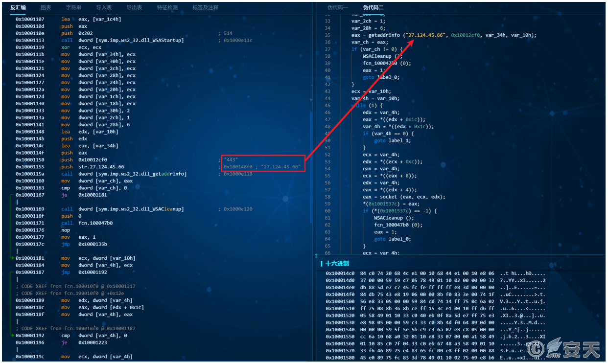 释放的Code_Shellcode后门.dll实际上是内存加载器,主要功能是连接到远程主机(27.124.45.66:443),接收Winos远控木马“上线模块.dll”并执行。