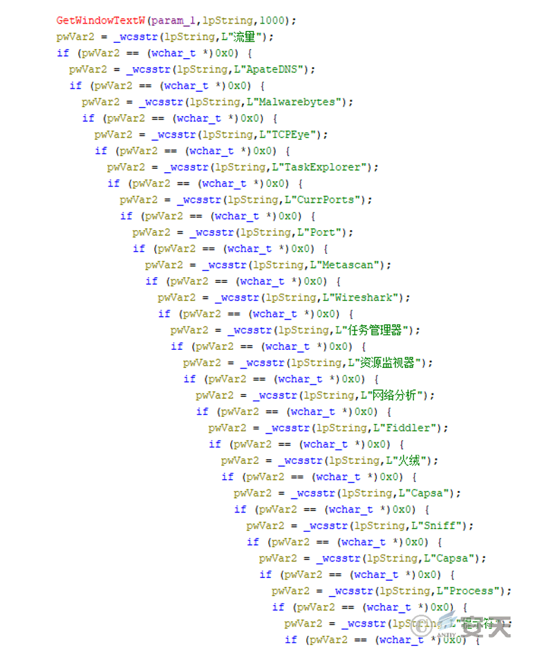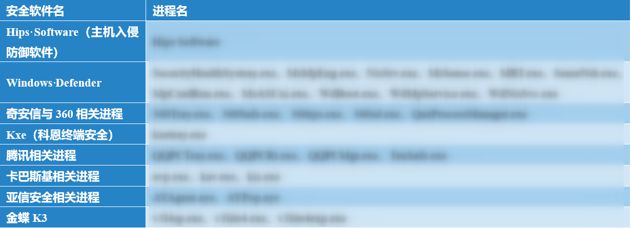 遍历进程检测如下安全软件进程名,结束当前表中存在的进程。