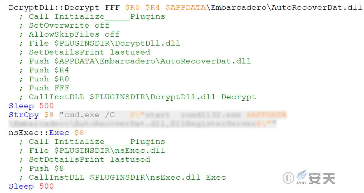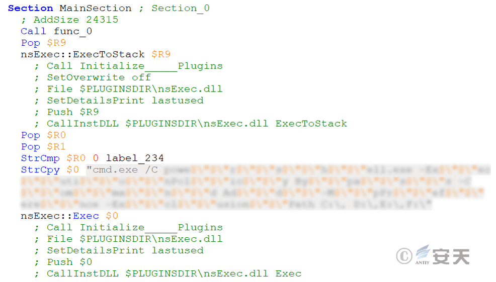 规避检测NSIS打包的加载器,用来释放和执行后续恶意样本,利用PowerShell命令将指定盘符加入Defender的排除列表