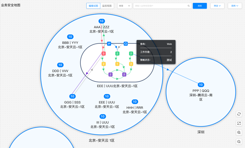 面对数据中心跨域异构的工作负载,通过微隔离模块自动梳理网内资产流量互访关系,根据地域位置、业务、应用角色等多个维度展示网内的流量视图,生成流量拓扑,解决网内流量可视化困难的问题。