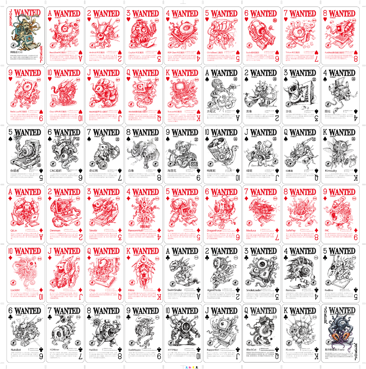 自2011年起,安天CERT工程师依托年度监测分析和研判结果,每年年初对上一年度有代表性的计算机威胁进行提炼总结和分类整理,印刷在一套扑克牌上,就成为了“威胁通缉令”。“黑桃♠”“红桃♥” “方块♦”“梅花♣” 4种花色分别对应上一年不同的威胁形态,数字大小则按照对应威胁的危害与影响进行调整。大小王则不是具体的病毒类型,而是最值得关注的TOP1和TOP2威胁趋势。安天AMPS网安文化工作室则以病毒名称、传播方式、危害对象等为启发,将相关病毒绘制成“妖魔鬼怪”的形象,从而让人们直观的感受到具象的“威胁”所带来的威胁,理解安全检测防护能力所带来的价值。从2024版通缉令开始,安天搭建开源平台,学习历史通缉令语料,由AI辅助完成形象创作。