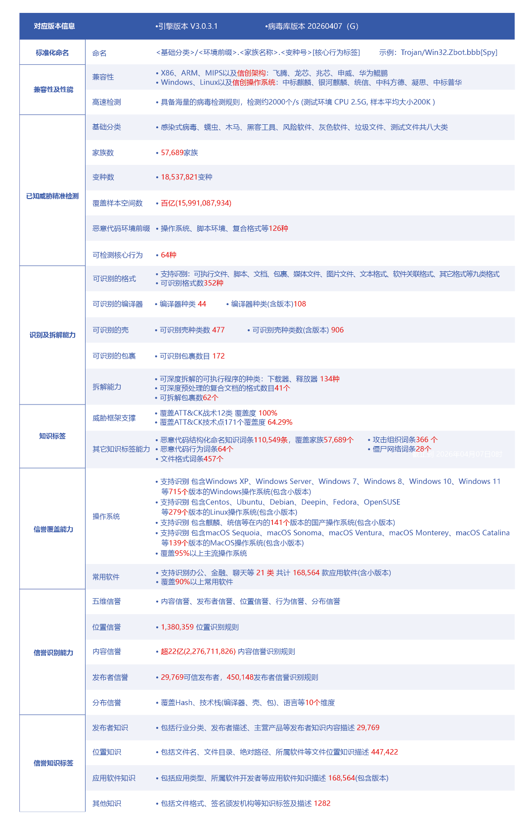 安天反病毒引擎基础参数表(本地库最后更新时间:2026年4月7日0时)