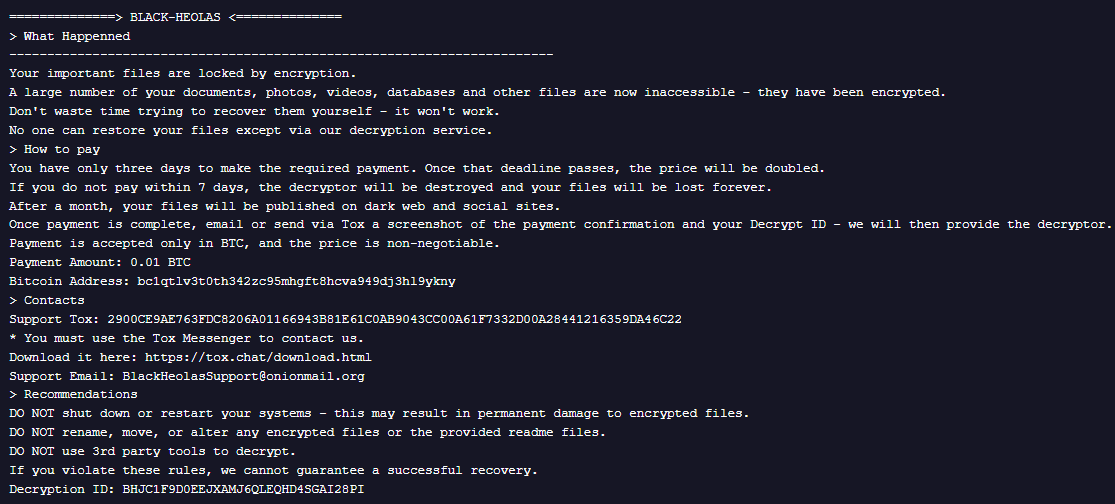 近期,安天实验室监测到Windows平台活跃勒索病毒样本Trojan/Win32.BlackHeolas[Ransom],该勒索病毒于2025年11月被捕获。该家族样本执行后,会在桌面释放自身副本,并将其重命名为“killyou.exe”,随后它会遍历系统目录,对文件进行加密,加密后的文件扩展名将变为“.hels”,同时生成名为“hels.readme.txt”的勒索文档。该样本通过Tor网络进行匿名通信,向受害者索取赎金。截至目前,尚未发现任何能够有效解密由BlackHeolas勒索病毒加密文件的工具。