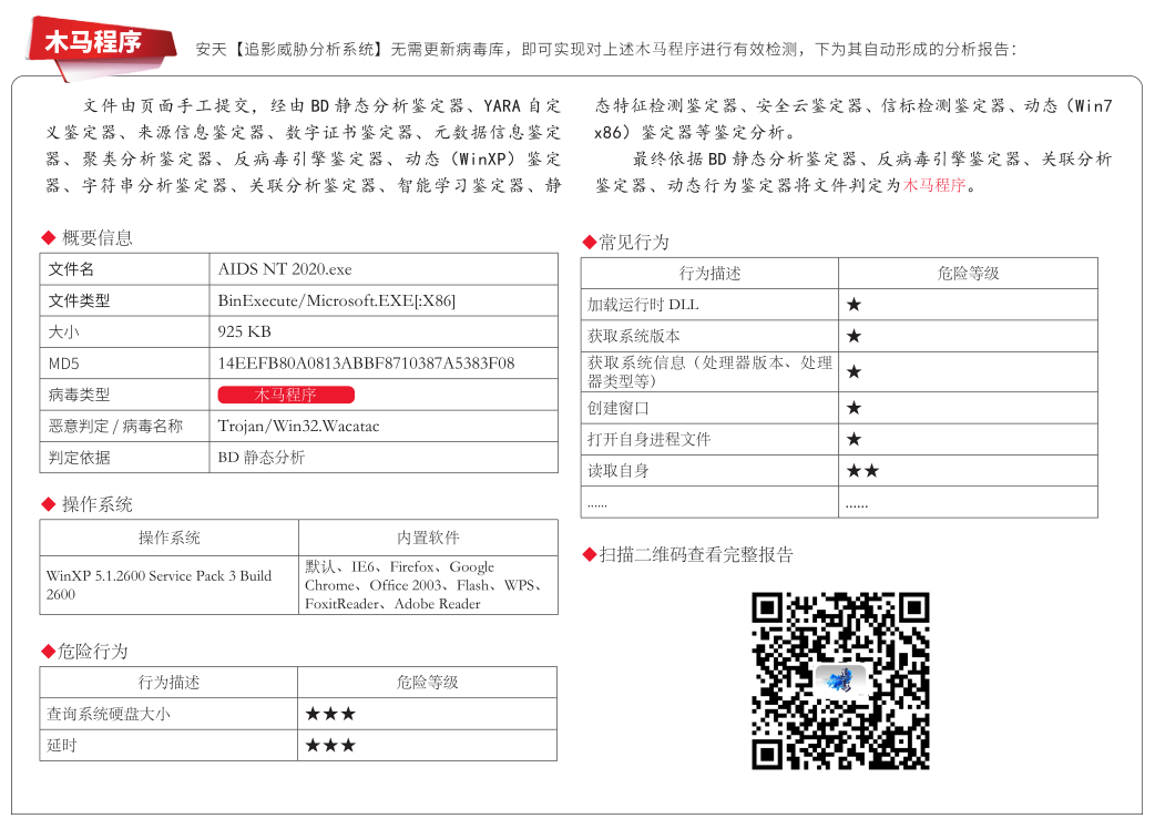 近日,安天 CERT 在梳理网络安全事件时发现一个名为 AIDS NT 2020 的勒索软件。该勒索软件最早发现于 2020 年 9 月,主要通过垃圾邮件进行传播,邮件附件为勒索软件程序,邮件内容诱使用户执行该程序。该勒索软件程序执行后,未发现有加密文件的行为,程序通过阻止用户的正常访问操作实现勒索。经验证,安天智甲终端防御系统(简称 IEP)的勒索软件防护模块可有效阻止 AIDS NT 2020 勒索软件的勒索行为。