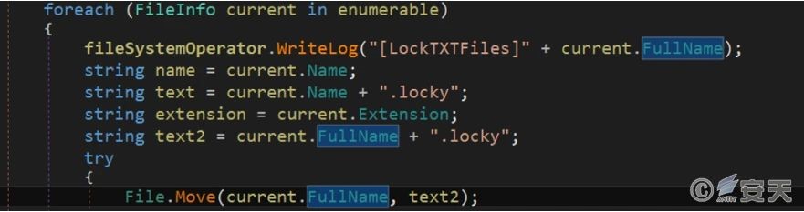 近日,安天CERT发现了一个勒索语言为中文的勒索软件。该勒索软件采用.net语言编写,模仿Locky勒索软件,对加密的文件追加“.locky”后缀名。其最早出现于2020年9月,试图采用非对称加密RSA、对称加密AES和XOR加密三种加密方式任意一种方式进行加密。由于其非对称加密RSA和对称加密AES部分功能未完善,安天CERT推测该样本可能为测试版本。本次分析的样本采用的加密策略是XOR加密,通过该方式加密的文件可以解密。