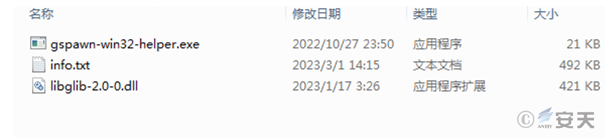 “C:\Users\Public\Documents\Arice\<随机6个数字及英文字母>”文件夹中有3个文件:可执行程序被重命名为随机的6个数字及英文字母,运行后加载第一阶段的libglib-2.0-0.dll文件,并读取info.txt文件中的Shellcode,最终在内存中执行第二阶段的DLL文件。