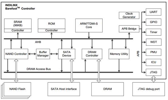 图中左边的框是固态硬盘的控制器,右边是板载外设和NAND FLASH阵列,部分型号的控制器还需要外置的Data Buffer RAM,也就是缓存。从图中可以看出,控制器本身就可以构成一个完整的计算机系统,其引导过程与机械硬盘类似,在此就不再重复了。