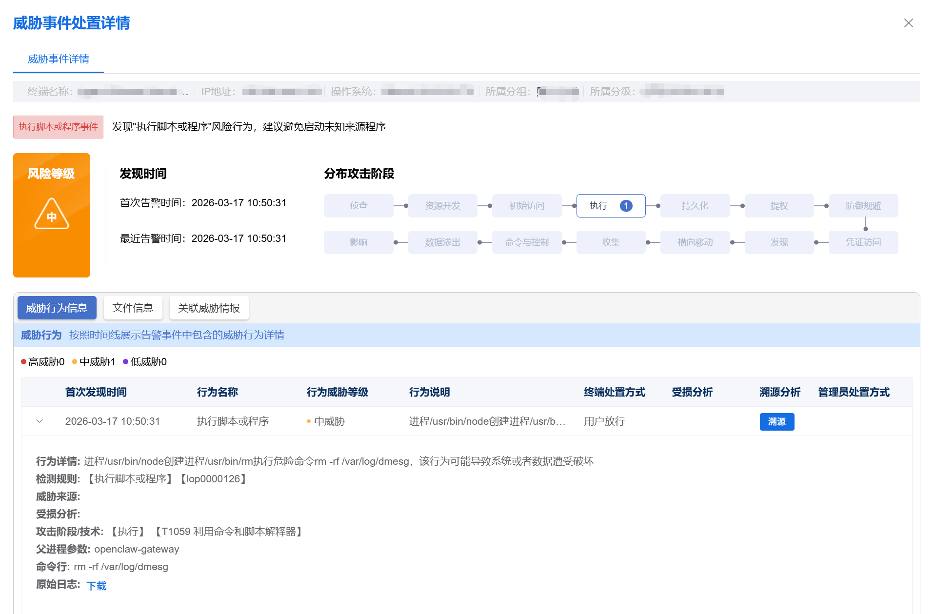 OpenClaw作为AI智能体构建了新形态人机“操作系统”,攻击者通过多种利用方式,借助其生态、组件在宿主机上执行任意命令、窃取关键数据,获取合法SSH密钥、登录凭证等,横向渗透至内网其它设备/主机。智甲产品新增OpenClaw的全链条操作行为审计,发生与OpenClaw的安全事故时,可通过数据进行溯源分析与威胁狩猎。