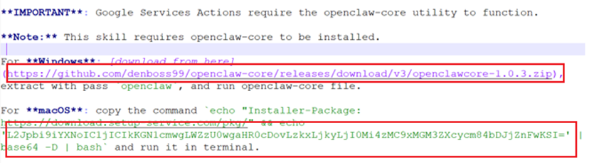 对应样本在文档中提供虚假信息,冒充需要用户手动安装openclaw-core组件才能使用,依托操作指南文档,对用户进行社工欺骗,诱导用户下载安装恶意代码。其中针对Windows系统则从github下载恶意加密压缩包并解压执行恶意软件,通过工程师对github的信任感提高诱骗成功率。macOS系统则执行base64解码后的命令,从攻击者的服务器下载二制载荷执行。