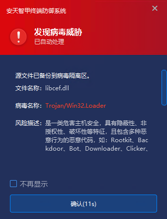 智甲可对本地磁盘进行实时监测,对新增文件自动化进行病毒检测。针对此次威胁,当病毒文件libcef.dll文件落地本地时,智甲会立即对病毒文件进行查杀并向用户发送告警,有效阻止病毒启动。