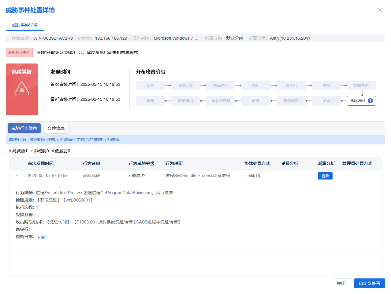 另外智甲具备驱动级主动防御模块,可以对进程行为实时监控,当发现进程存在风险行为时可立即拦截,有效防止攻击行为执行。本次事件中,当攻击者利用Shine.exe加载恶意文件libcef.dll时,智甲会通过内存防护模块捕获恶意程序加载行为,并立即拦截。